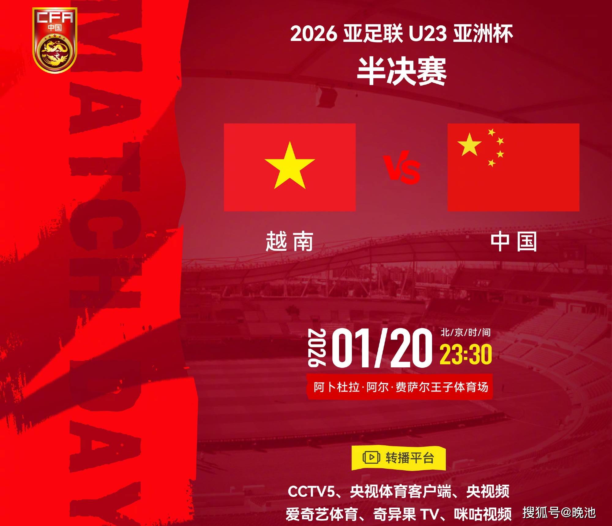 今晚(北京时间1月20日晚)23时30分,2026年亚足联U23亚洲杯第二场半决赛在沙特吉达的阿卜杜拉-阿尔-费萨尔王子体育场拉开战幕,U23国足对阵来自东南亚的越南男足。本场比赛为一场定胜负,90分钟常规时间战平,则进行30分的加时赛,再战平则进行残酷的点球大战。