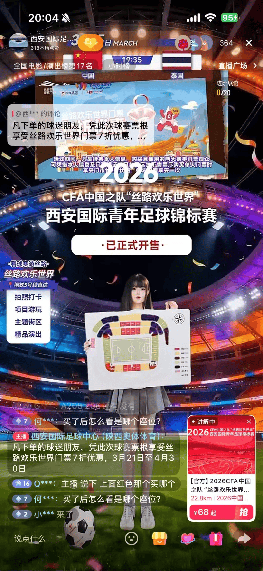 同时,骏途网在抖音直播售票环节首创“XR沉浸式直播”模式,告别传统绿幕抠图与常规现场直播,实现从平面展示到沉浸式体验的全面升级。直播间虚实融合、场景震撼,真实还原西安国际足球中心三维场馆,球迷可直观感受虚拟看台,360° 预览不同区域观赛视野、座位视角,选座购票更清晰、更具沉浸感。