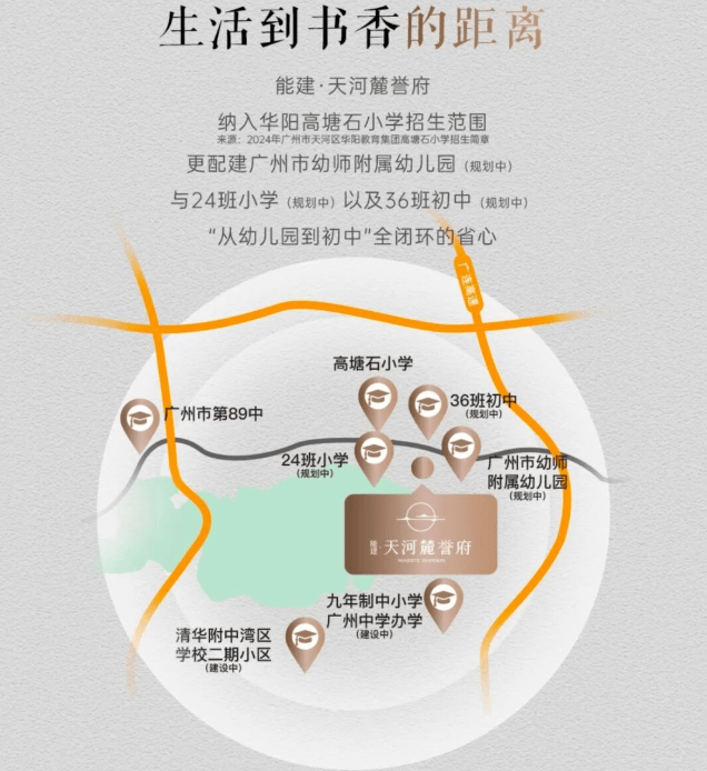 小学方面,项目对口华阳教育集团高塘石小学。高塘石小学创办于1948年,从村办小学发展为“全国青少年校园足球特色学校”,2023年正式加入广州华阳教育集团,由核心校派出骨干团队进行管理,开启高质量发展新航程。根据规划,该校计划3年内扩建至24班,新增建筑面积超9000平方米,将进一步提升办学规模和教学质量,有效缓解天河区东北部学位紧张状况,为孩子们提供更优质的教育资源。