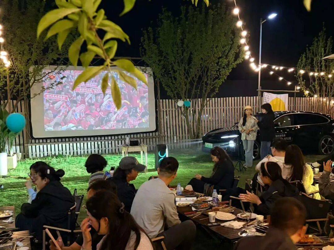 铜山区喵喵花园里串灯摇曳,暖意融融,球迷们围坐草地,桌上摆满烧烤美食,正通过大屏直播为苏超赛事呐喊助威,大家一同为徐州球队的表现欢呼喝彩,把露营观赛的氛围感拉满。