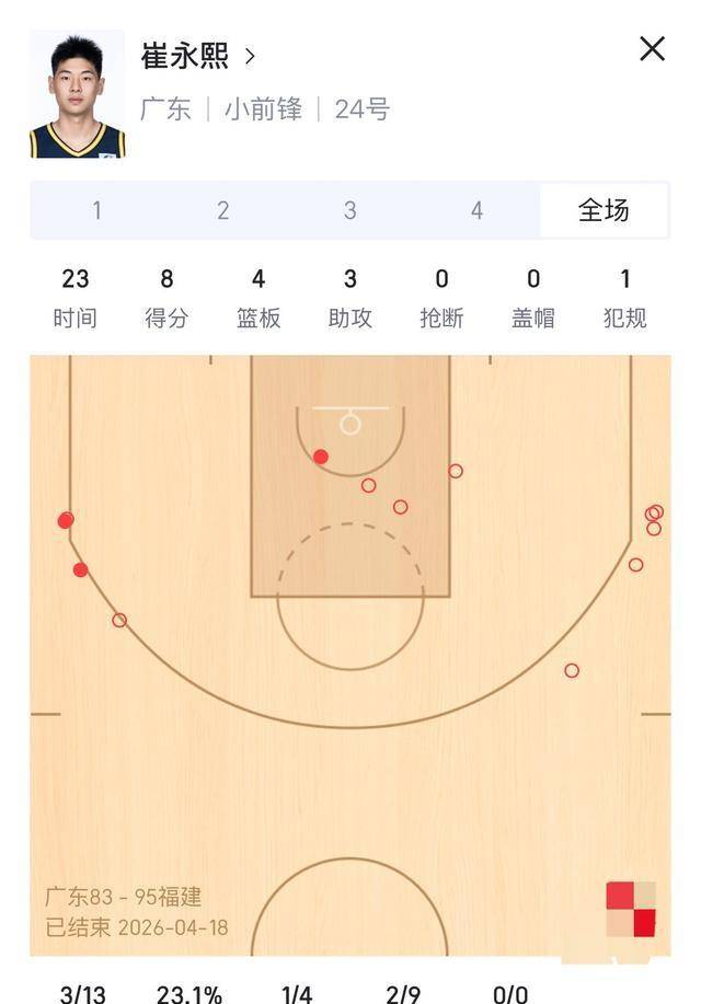 广东队现在的体系,太需要锋线能提供稳定的火力输出了。老将们的体能经不起全场折腾,后卫线需要锋线拉开空间才能往里突。崔永熙在场上的这23分钟,进攻端就像一个黑洞,球到了他手里就停滞,战术完全跑不出来。关键时刻,当球队需要有人站出来止血、需要有人扛着炸药包往里杀的时候,他完全隐身了。这种“难堪大用”的表现,比单纯的投篮打铁更伤球队的士气。