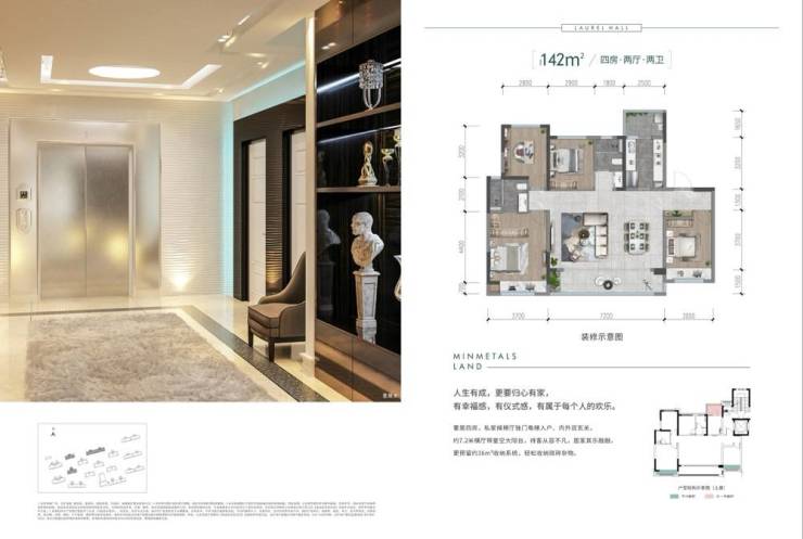 • 6.8米景观阳台+4米开间客厅• 四室朝南+主卧双衣帽间• 独立候梯厅+双玄关系统