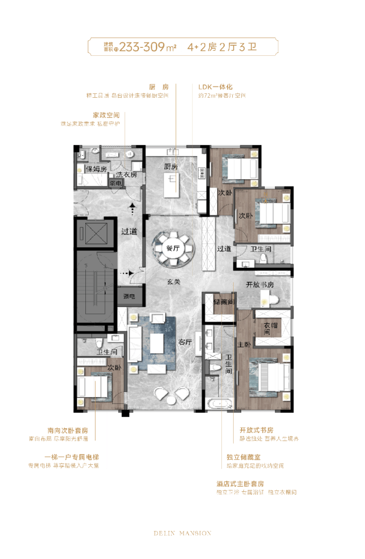 房子是精装大平层,面积从233到309平米,格局非常阔绰。都是4房2厅3卫的配置,有的还带保姆间和独立书房,是名副其实的终极改善之选。