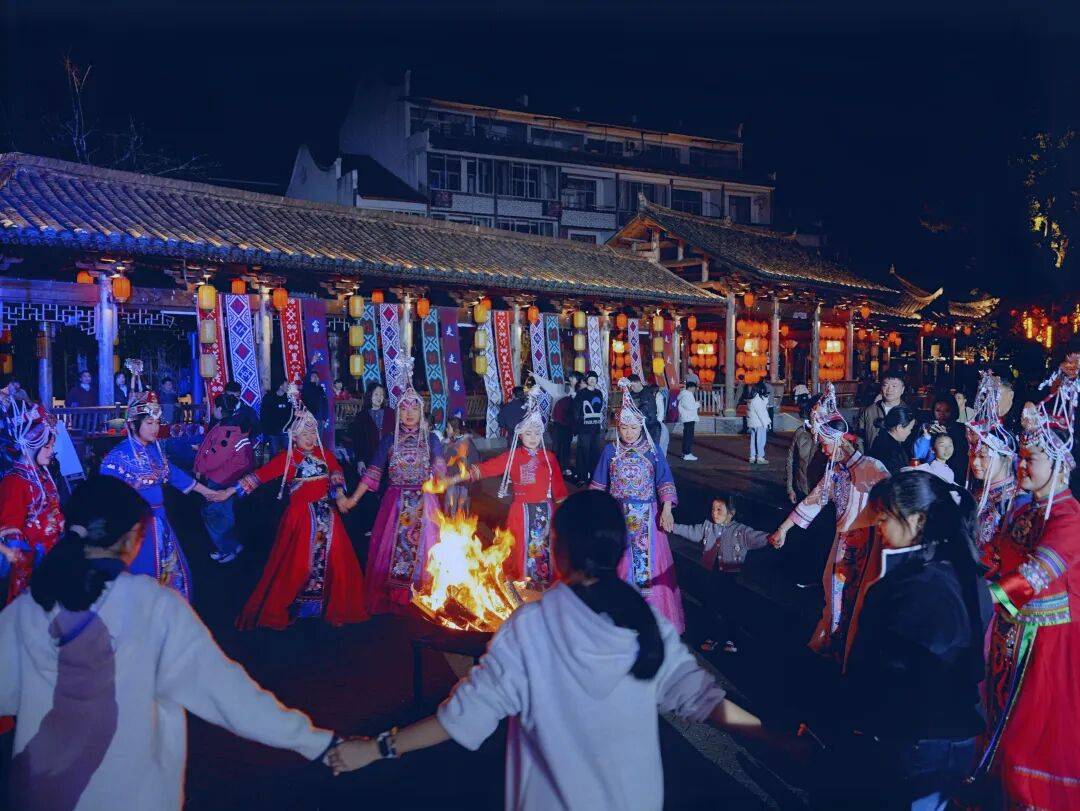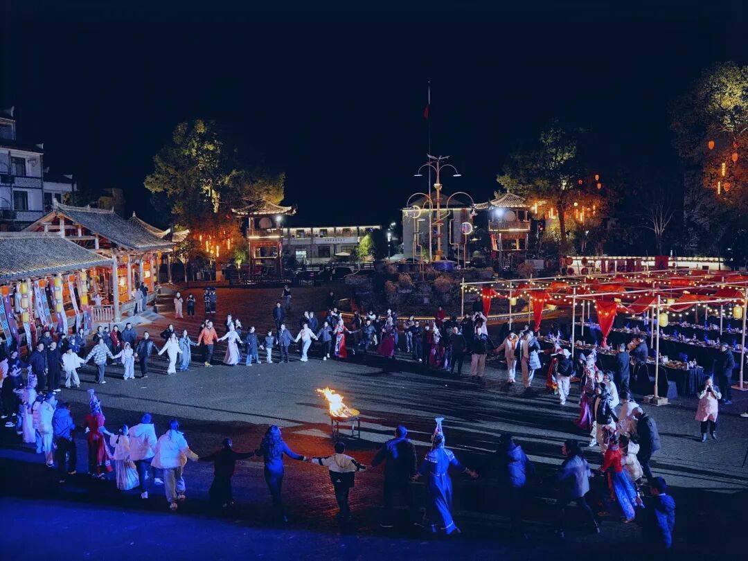 19点,篝火晚会准时拉开帷幕。熊熊火焰在空地上腾空而起,橘红色的火光映红了每个人的笑脸,驱散了冬夜的寒意。畲族年轻人围着篝火绕行,嘹亮的畲歌在山谷间回荡,歌词里满是对新年的期盼与祝福。畲族舞者还热情的邀请游客参加,大家手拉手围着篝火尽情狂欢,将畲乡的年味推向高潮。